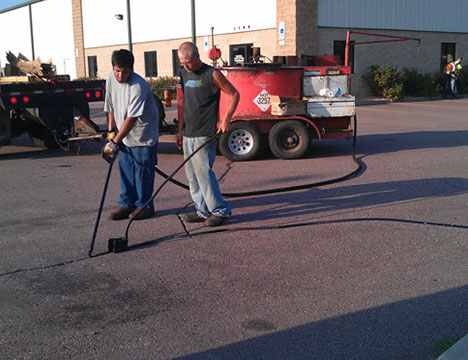 So you may be wondering how to fix asphalt cracks in your blacktop parking lot. First we recommend contracting a parking lot repair company that not only has the proper asphalt repair equipment but well-trained and experienced crews to repair your parking lot cracks. Our parking lot crack repair process includes routing the cracks and joints to clean the crack surfaces and create a reservoir. This reservoir allows the asphalt crack seal to move as your pavement expands and contracts seasonally. Next in repairing asphalt cracks is cleaning out the loose debris with compressed air to allow maximum sealant adhesion. Finally we seal the parking lot cracks with a hot-applied, polymer-based, asphalt sealant.