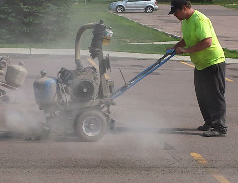 So you may be wondering how to fix asphalt cracks in your blacktop parking lot. First we recommend contracting a parking lot repair company that not only has the proper asphalt repair equipment but well-trained and experienced crews to repair your parking lot cracks. Our parking lot crack repair process includes routing the cracks and joints to clean the crack surfaces and create a reservoir. This reservoir allows the asphalt crack seal to move as your pavement expands and contracts seasonally. Next in repairing asphalt cracks is cleaning out the loose debris with compressed air to allow maximum sealant adhesion. Finally we seal the parking lot cracks with a hot-applied, polymer-based, asphalt sealant.